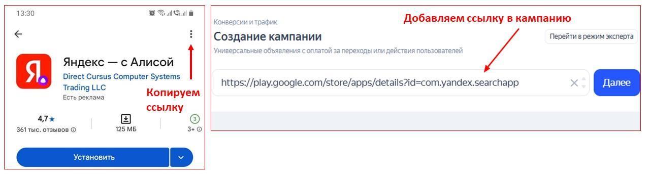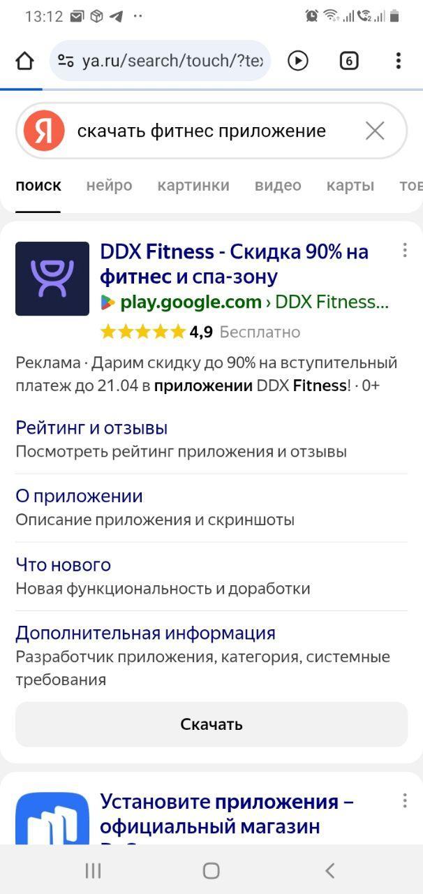 РМП показывается на Поиске и в Рекламной сети Яндекса, но не на десктопах, а только на планшетах и смартфонах — то есть на устройствах, готовых к установке приложения. Есть разделение на операционные системы (Android и iOS), чтобы показывать владельцам определенного устройства именно ту ссылку, которая для него подходит. Внешне РМП на выдаче ничем не отличается от обычных объявлений — те же заголовок и текст, а вместо домена — ссылка на соответствующий магазин (стор).