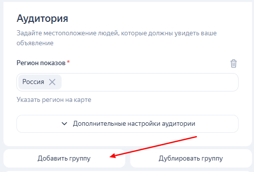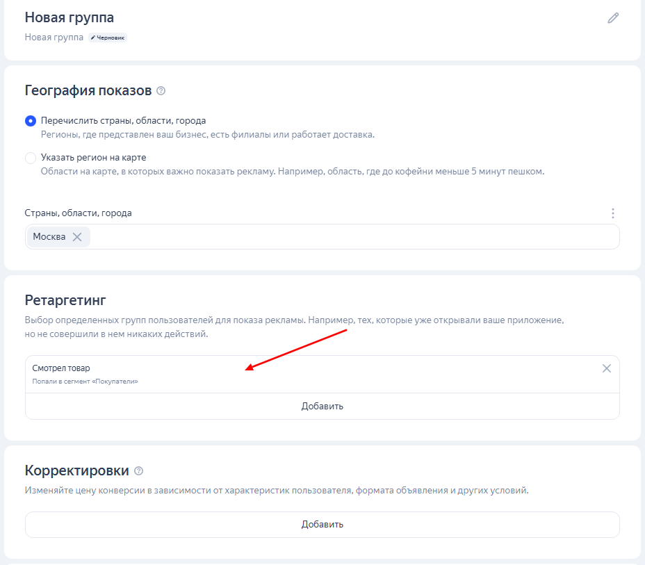 Таргетинги на уровне групп тоже зависят от цели кампании. Для ретаргетинговых кампаний в качестве условия показа можно задать только условие ретаргетинга.