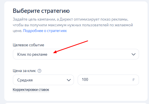 Прежде всего выбираем целевое событие — цель нашей рекламы. Если это «Клик по рекламе», то стратегия работает по аналогии с «Максимум кликов», то есть старается как можно чаще показывать объявление потенциально «кликабельным» пользователям. Ограничения для системы — средняя цена клика и недельный бюджет.