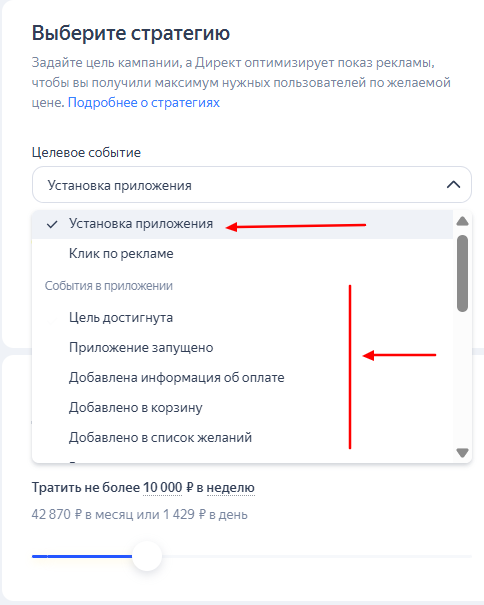 Если выбираем целевое событие «Установка» и среднюю цену за достижение цели, то стратегия работает по аналогии с «Максимум конверсий с оплатой за клики». Точно так же стратегия работает, если выберем целевое событие внутри приложения (например, покупку или добавление в корзину).