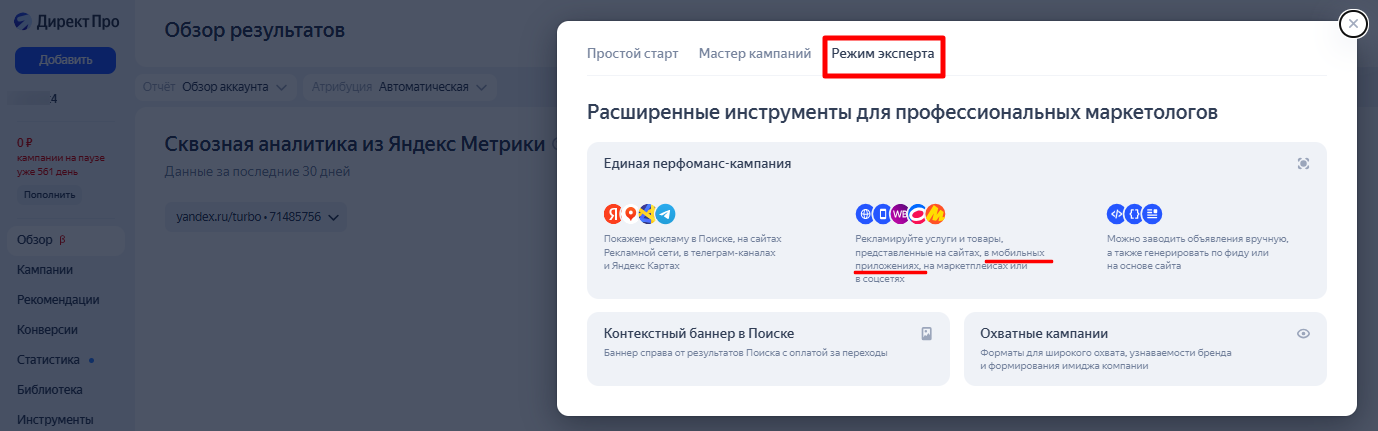На этом этапе выбираем «Режим эксперта» — «Единая перфоманс-кампания».