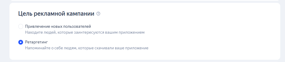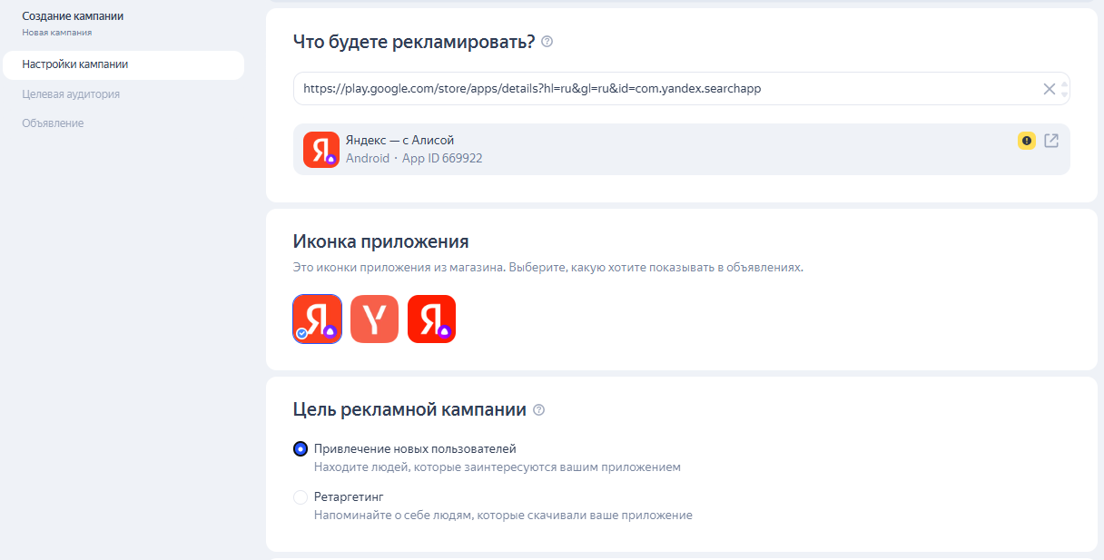 Если наша задача — вывести новое приложение на рынок и увеличить количество его установок, выбираем «Привлечение новых пользователей». Директ определяет, есть ли эта программа на устройстве, и не показывает рекламу тем, у кого она уже есть. Если хотим сподвигнуть действующих пользователей на совершение внутренней конверсии, выбираем «Ретаргетинг». Изменить цель после того, как кампания будет создана, нельзя.