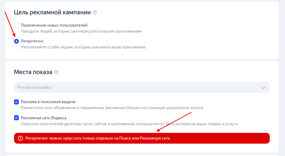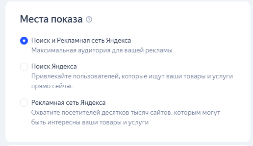 Если на Шаге 4 мы выбрали «Привлечение новых пользователей», то в текущем шаге можем выбрать Поиск, или РСЯ, или обе площадки. Если же планируем запускать кампанию по ретаргетингу, то можно выбрать только одну из площадок.