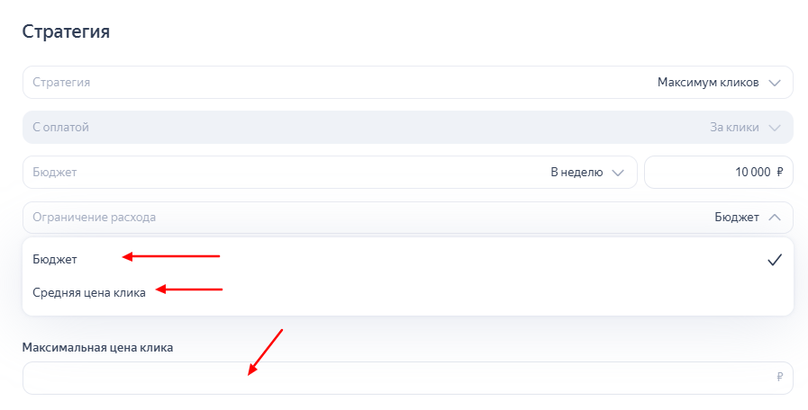 Так же, как и в Мастере, доступны «Максимум кликов» и «Максимум конверсий». В первом варианте можем выбрать ограничение «Недельный бюджет + средняя цена клика» или же только «Бюджет» и при этом ограничить максимальную цену клика.