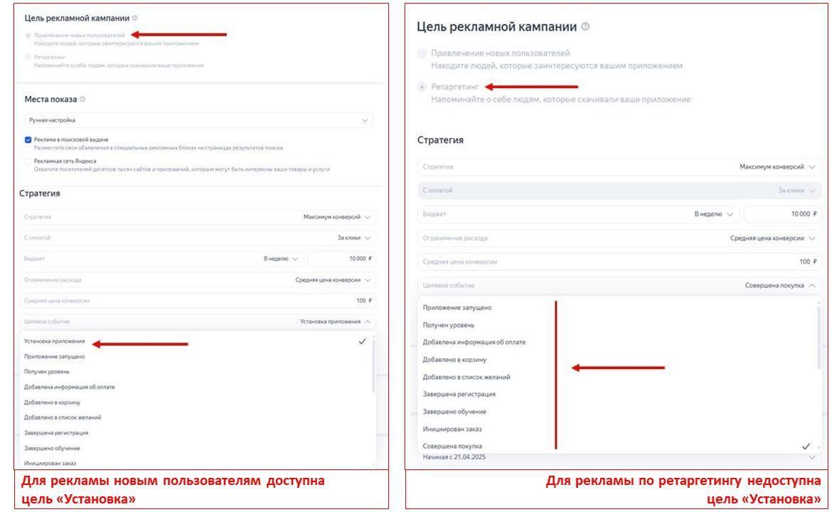 Настройка «Максимум конверсий» зависит от того, что выбрано в качестве цели кампании. Если это привлечение новых пользователей, то нам доступна для оптимизации цель «Установки» + цели внутри приложения. Если выбирали ретаргетинг, то оптимизация по установкам будет недоступна.