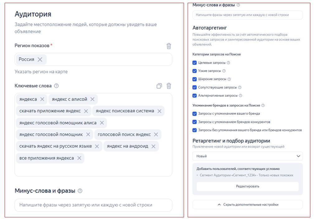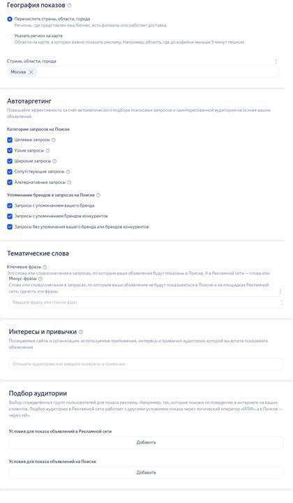 В тех, что для новых пользователей, видим привычные условия: автотаргетинг, ключевые фразы и минус-слова, интересы и привычки. Условие ретаргетинга тоже можно добавить, но опционально.