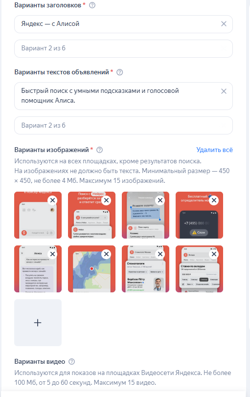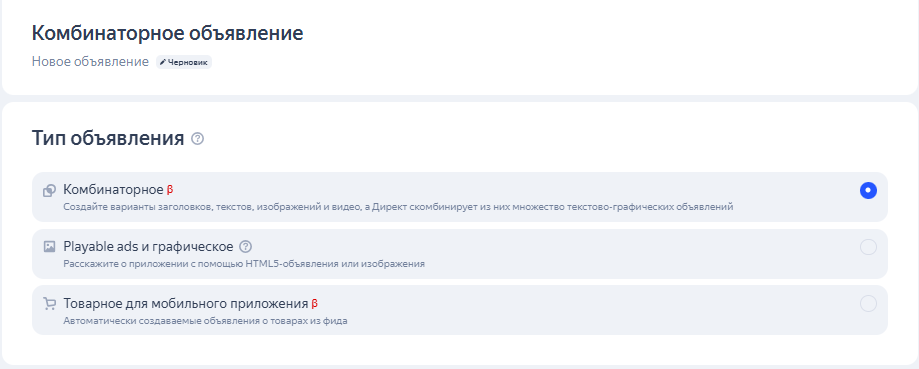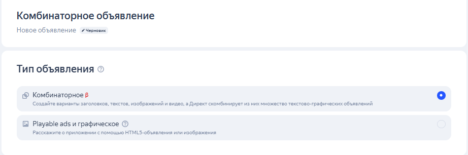 - Комбинаторное. Фактически, обычное текстово-графическое, но Директ может перемешать ваши заголовки и тексты, чтобы подобрать наиболее эффективную комбинацию;