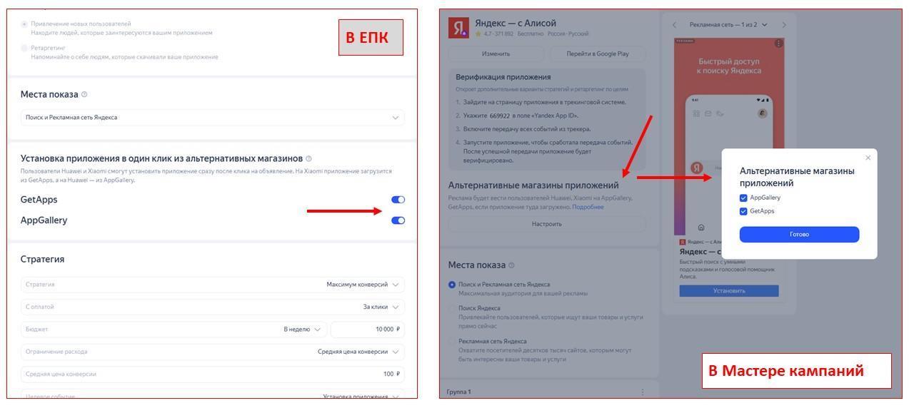 В самом начале статьи мы обещали вернуться с дополнением про альтернативные магазины приложений. На скриншоте показано, как выглядит настройка в Мастере кампаний и в ЕПК.