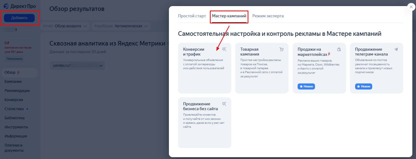 Выбираем «Добавить» — «Кампанию» — «Мастер кампаний» — «Конверсии и трафик».
