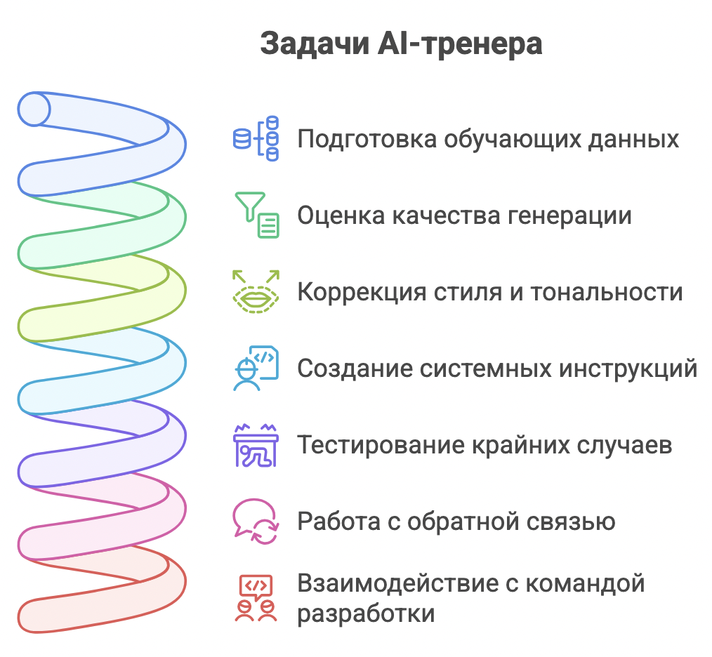 Работа AI-тренера включает широкий спектр задач, которые могут меняться в зависимости от стадии проекта. Рассмотрим основные из них.