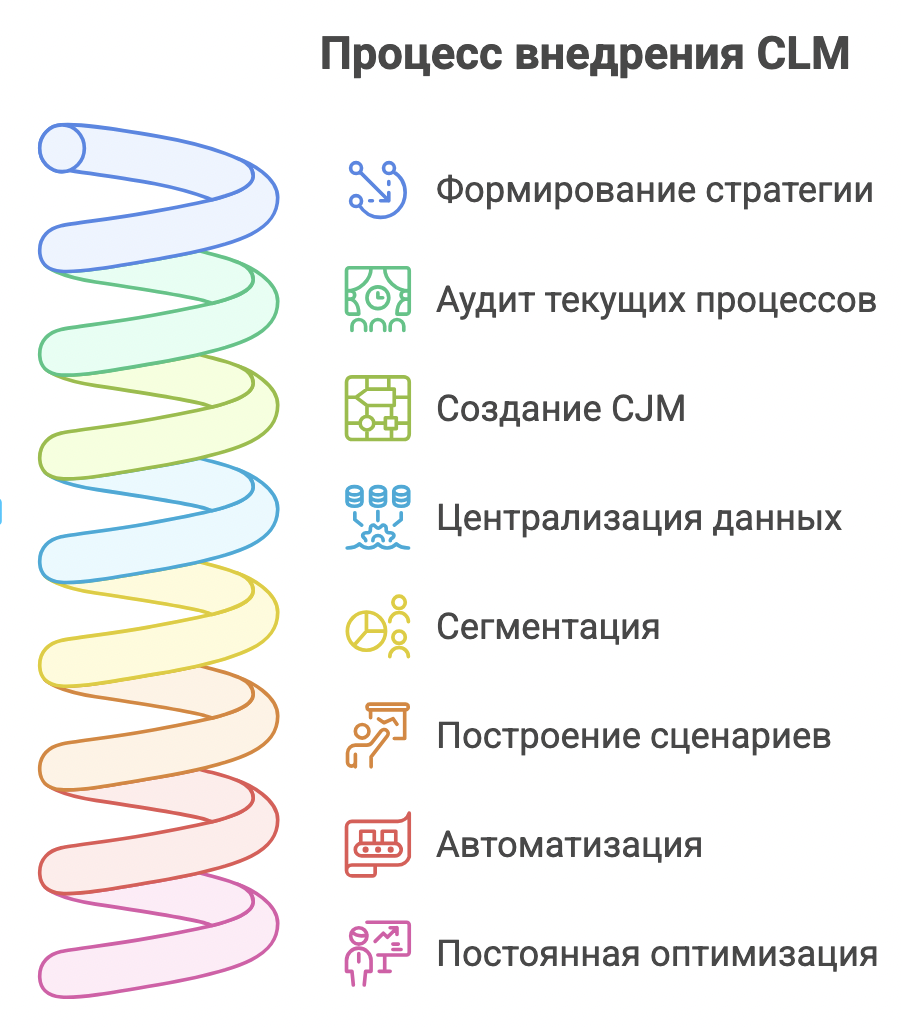 Внедрение CLM — это трансформация подхода к работе с клиентами. Оно состоит из нескольких этапов.