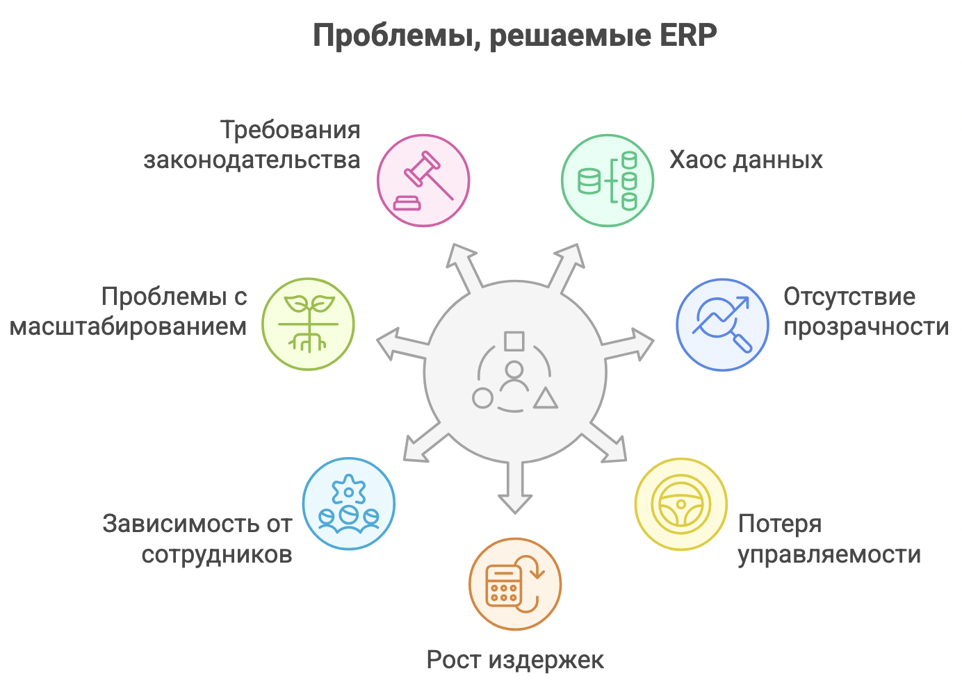 В результате одни и те же показатели отличаются в зависимости от источника. Руководитель получает несколько версий «правды» и вынужден тратить время не на развитие компании, а на выяснение, какие цифры корректны. ERP устраняет эту проблему за счет единой базы данных и единой логики учета.