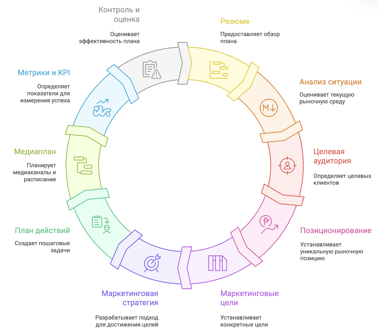 Маркетинговый план содержит конкретные шаги по реализации маркетинговой стратегии.