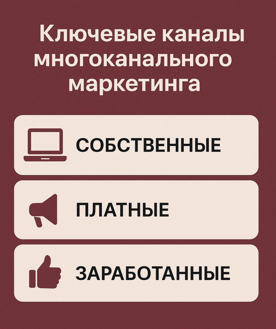 Каналы — это «места», где клиент может познакомиться с брендом, прочитать, спросить, сравнить и купить. Условно их делят на собственные, платные и заработанные.
