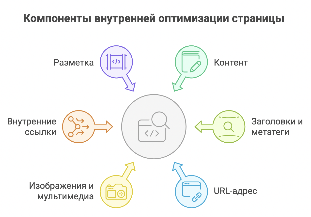 Внутренняя оптимизация страницы включает несколько составляющих, которые работают вместе. Основные элементы можно разделить на три большие группы: контент, технические аспекты страницы и структура.