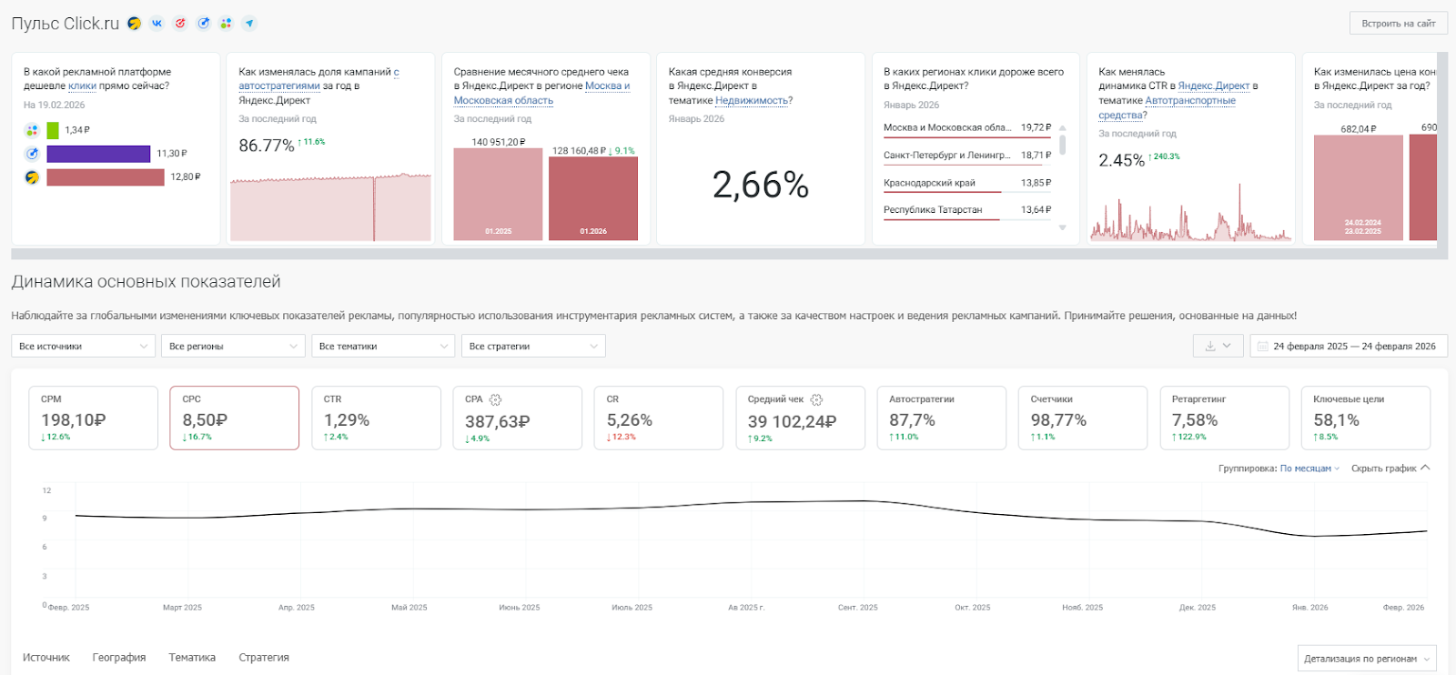 «Пульс» click.ru — инструмент, который помогает следить за рынком в заданный период и составлять грамотную стратегию поведения. В нем можно узнать CPC, CPM, CPA, CR, CTR, средний чек, главные цели и другие важные показатели. Данные фильтруются. Например, по регионам, рекламным системам, тематикам. В «Пульсе» есть обезличенная статистика из VK Рекламы, Директа, Avito, myTarget, Telegram Ads. Для Директа имеется как общая статистика, так и отдельная по Сетям и Поиску. Похожая ситуация с Telegram Ads: помимо общей информации есть данные по таргетингам на пользователей и на каналы.