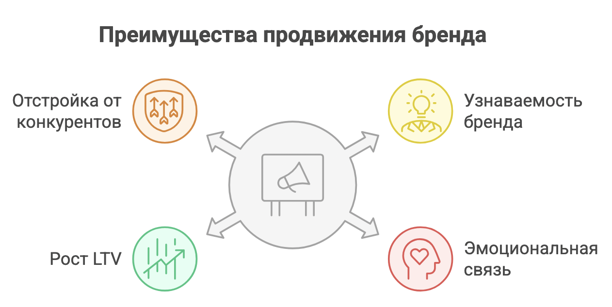 Продвижение бренда действует иначе. Здесь ставка делается на долгую дистанцию: сначала формируется узнаваемость, затем — доверие, и только потом — устойчивый спрос. В такой модели клиент приходит уже подготовленным, и нет необходимости долго убеждать его.