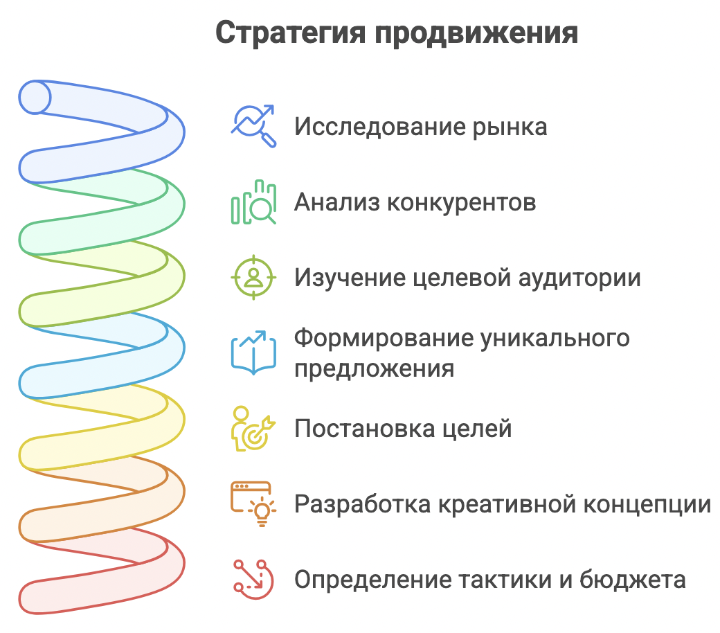 Стратегия продвижения — это понятный план действий: куда двигаться, с кем работать и за счет чего расти. Обычно она собирается из нескольких логичных этапов, каждый из которых отвечает на свой вопрос.