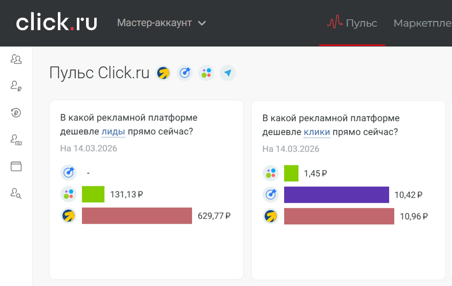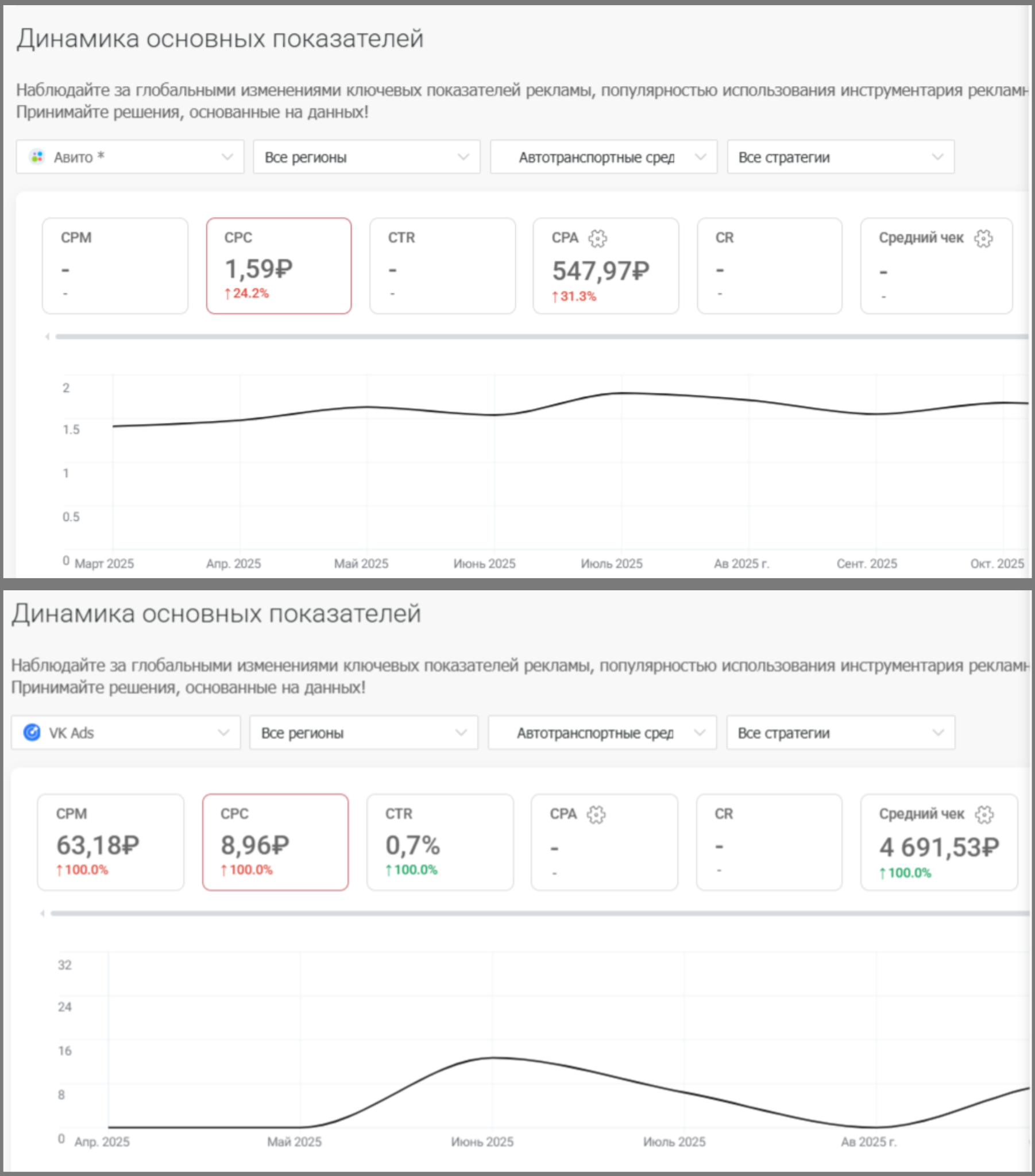 Например, «Пульс click.ru» показывает, что за прошедший год (с марта 2025-го по март 2026-го) средняя стоимость перехода в категории «Автотранспортные средства» в Авито Рекламе составляет 1,59 рублей, а в Vk Ads — 8,96 рублей: