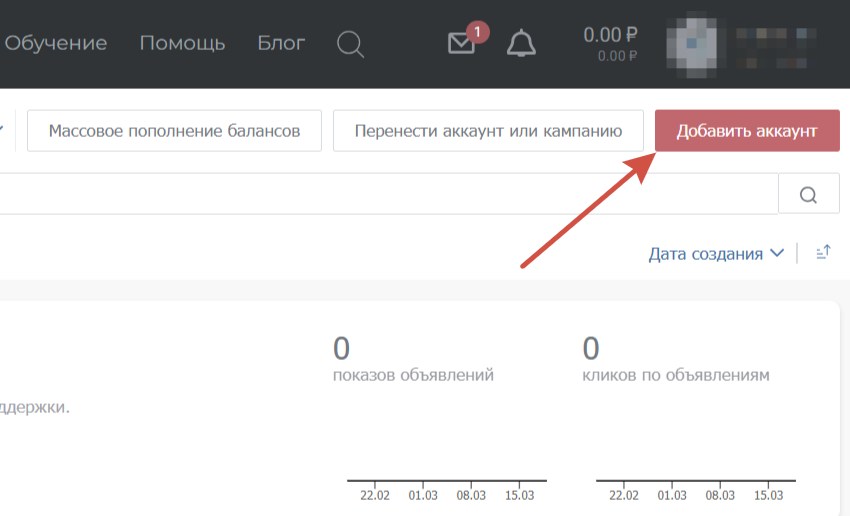 Шаг 1. Нажимаем «Добавить аккаунт» в правом верхнем углу личного кабинета click.ru: