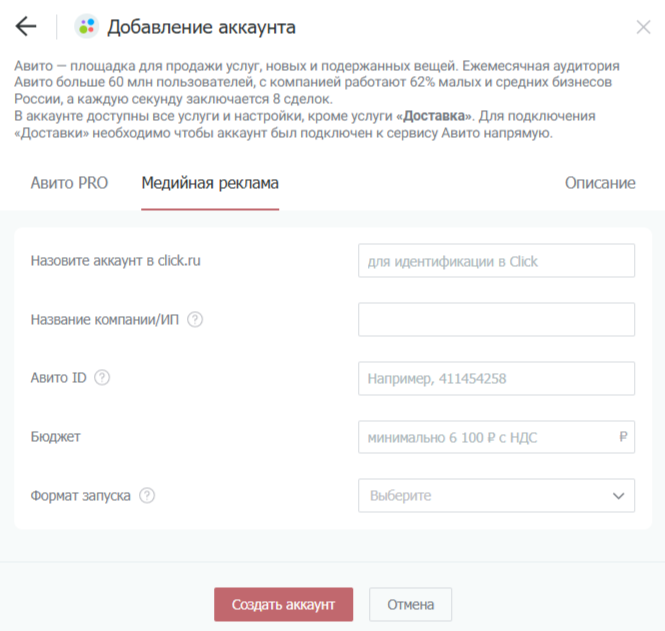Шаг 3. Переходим на вкладку «Медийная реклама», заполняем необходимые поля и нажимаем «Создать аккаунт»: