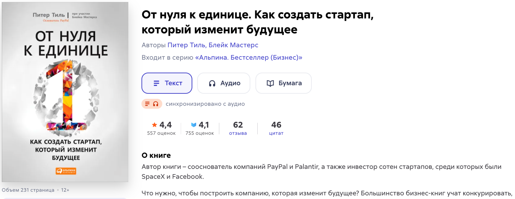 «От нуля к единице» — это «неудобная» книга, так как она ломает привычные представления о рынке, конкуренции и успехе. Питер Тиль прямо говорит: если вы боретесь с конкурентами, вы уже проигрываете. Настоящая ценность появляется там, где конкуренции почти нет, потому что продукт, идея или подход уникальны.