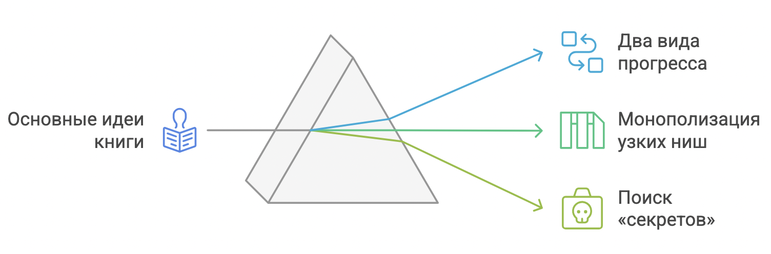 - вертикальный (от нуля к единице). Создание чего-то принципиально нового — категории, продукта или технологии, которых раньше не существовало. Именно этот вертикальный прогресс — настоящий источник долгосрочной ценности и экономического роста.