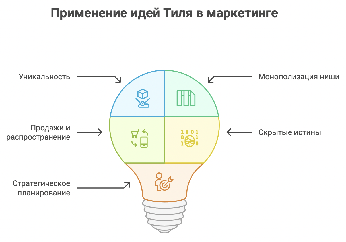 Многие маркетологи ориентируются только на улучшение существующих предложений: «мы сделали интерфейс лучше на 5 процентов» или «добавили несколько функций». По мнению Тиля, такие шаги ведут только к усилению конкуренции и еще более насыщенному рынку, где выигрыш дает лишь временное преимущество. Вместо этого маркетологам стоит искать и формировать уникальную ценность, которой нет ни у кого. Это может быть комбинация функциональности, сервиса, позиционирования или образа бренда, которую никто другой не предлагает.