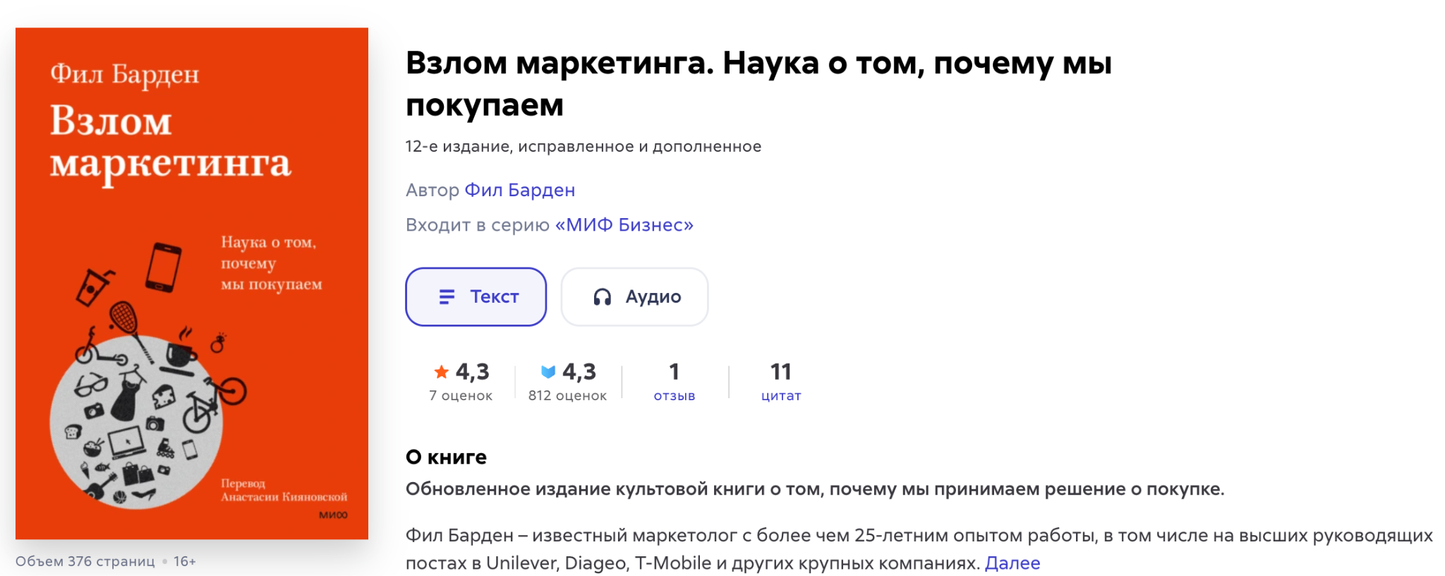Есть книги о маркетинге, которые дают набор инструментов: чек-листы, приемы, шаблоны рекламных кампаний. А есть книги, которые меняют саму точку зрения на процесс продаж. «Взлом маркетинга. Наука о том, почему мы покупаем» Фила Барденa — именно из второй категории. Автор не просто рассуждает о том, как привлечь внимание аудитории — он показывает, что решения покупателей можно объяснить с точки зрения когнитивной психологии и нейробиологии.