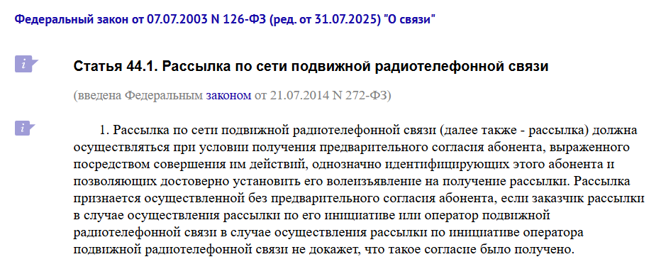 Помимо закона «О связи», Федеральный закон «О рекламе» (№ 38-ФЗ) также прямо запрещает распространение рекламы по сетям электросвязи (включая мобильную связь) без предварительного согласия абонента.