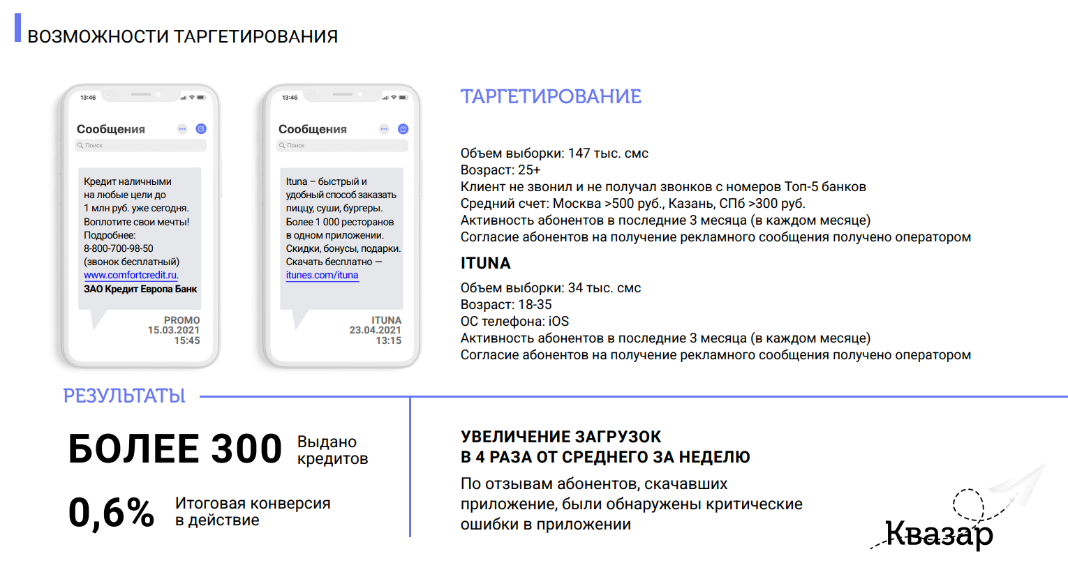 В России набирает популярность инструмент мобильного маркетинга, принципиально отличающийся от рекламы в интернете. Речь о таргетированных СМС-рассылках, которые используют данные операторов связи, а не контакты из базы клиентов, как это было раньше. Это позволяет не только привлекать новую аудиторию, но и сегментировать ее по физическим параметрам: геолокации вплоть до дома, примерному уровню дохода, мобильной активности и др. И один из таких сервисов — Квазар.