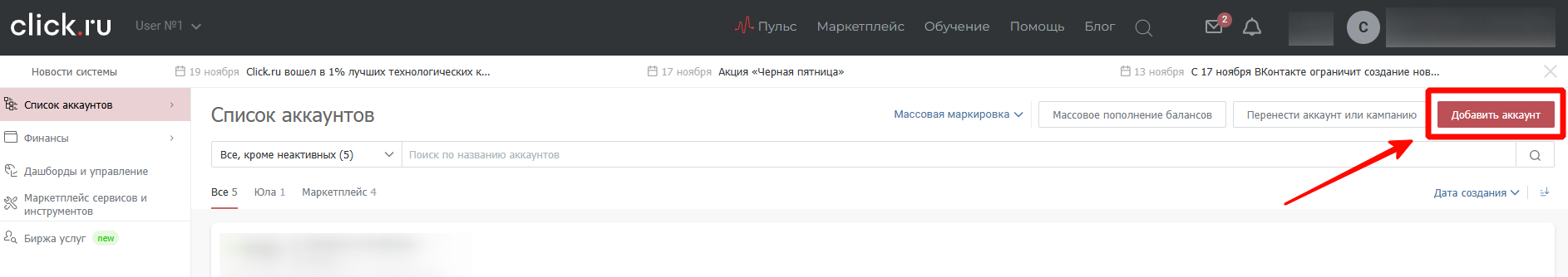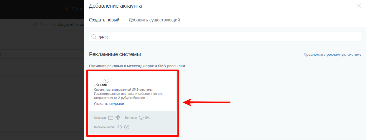 Необходимо авторизоваться в аккаунте click.ru, нажать на «Добавить аккаунт» и найти сервис Qazar.
