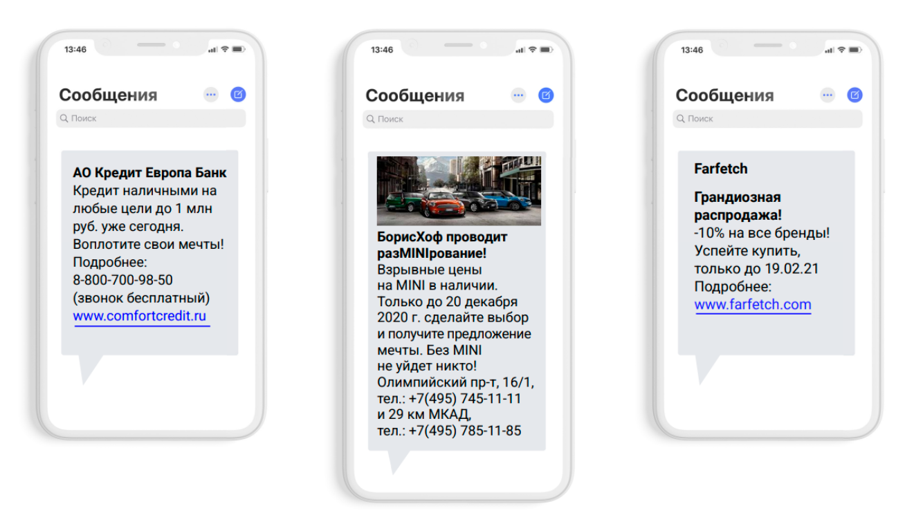 3. Рассылка рекламных сообщений. Само сообщение в формате SMS или MMS отправляется не с обычного номера, а с альфа-имени (например, BURGER-KING или SushiGo), что повышает его узнаваемость. Средняя цена одного контакта с потенциальным клиентом в этом канале в России варьируется от 50 копеек до 8-9 рублей.
