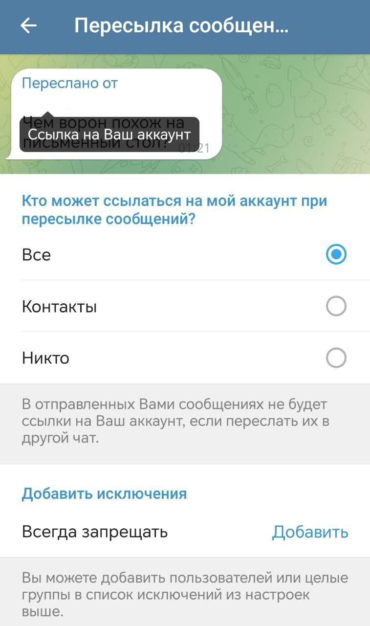 Когда cобеседник пересылает ваши сообщения, их получатель видит ссылку на аккаунт и ваше имя. Но это тоже настраивается. Например, вы можете запретить пользователям видеть ник и ссылку на аккаунт или разрешить доступ только своим контактам. Это можно сделать в разделе «Настройки» → «Конфиденциальность» → «Пересылка сообщений».