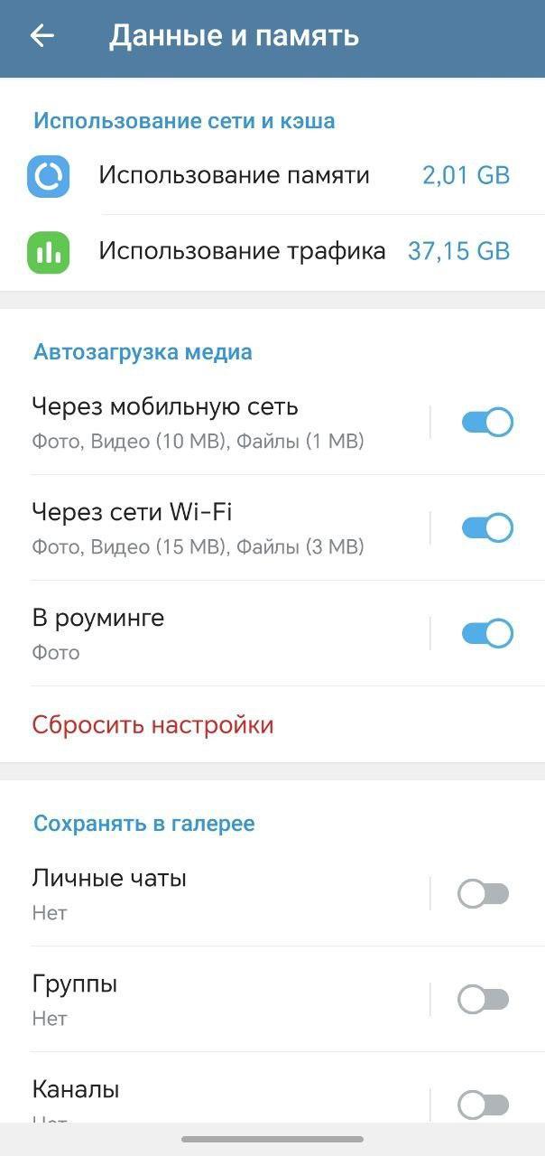 Чтобы отказаться от автоматической загрузки медиафайлов, откройте «Настройки» → «Данные и память» → «Автозагрузка медиа». В разделе можно выбрать, что нужно загружать, а что нет. Например, вы можете оставить автоматическую загрузку контента при подключении к Wi-Fi, но отключить ее в роуминге.
