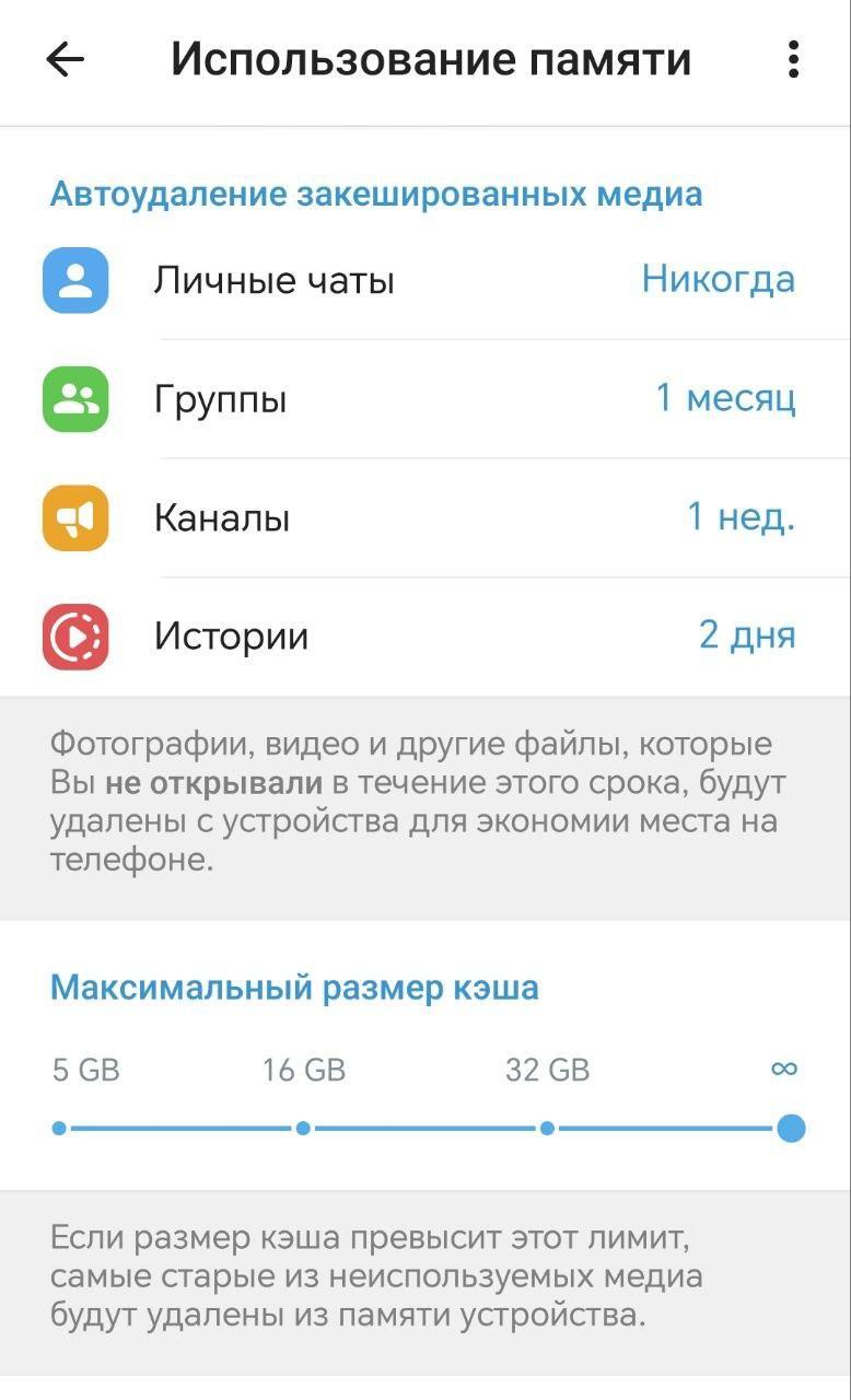 Чтобы установить лимиты, зайдите в «Настройки» → «Данные и память» → «Использование памяти». Здесь вы можете установить количественные и временные пределы накопления кэша. Если лимиты превышены, кэш будет удаляться сам.