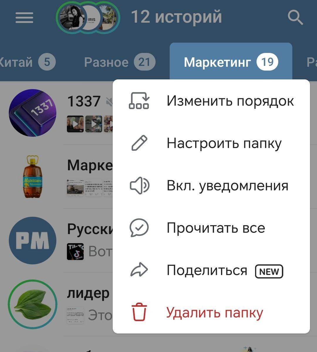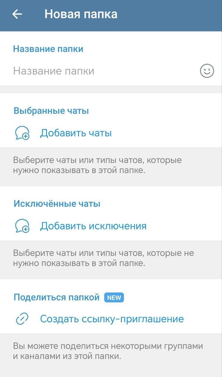 При настройке можно выбрать, какие типы чатов показывать в папке: