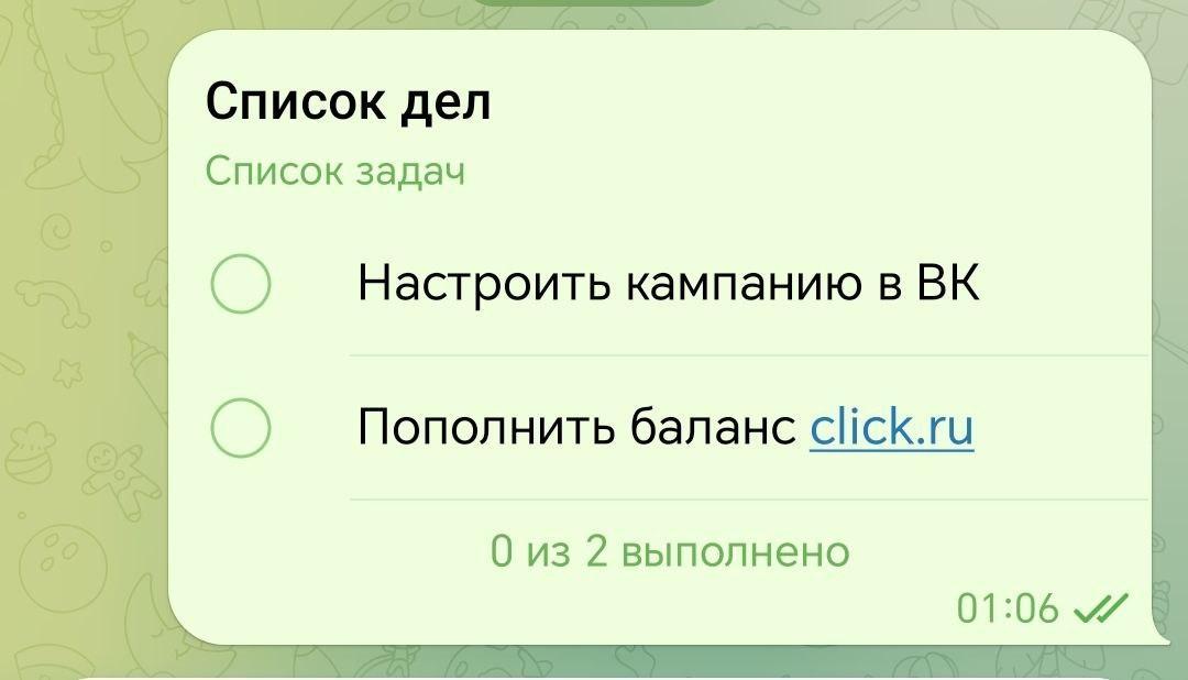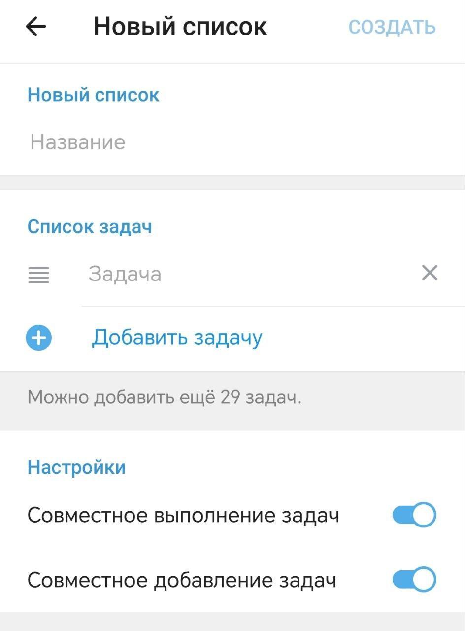 Создается список через меню вложений: Вложения → «Список». Готовые списки можно отправлять в личные и групповые чаты или сохранять в «Избранном».