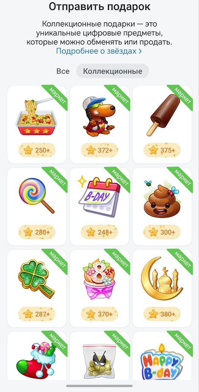 При покупке подарок можно сразу оформить как коллекционный и прямо в чате увидеть, как получатель распаковывает новый арт-объект. Конвертация стоит небольшое количество звезд Telegram.