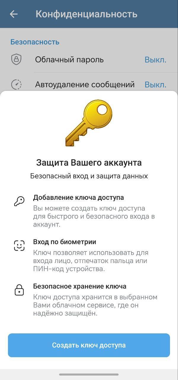 В Telegram можно настроить ключ доступа (passkey) на устройстве и входить в аккаунт по ПИН-коду или Face ID / отпечатку пальца вместо подтверждения через SMS.