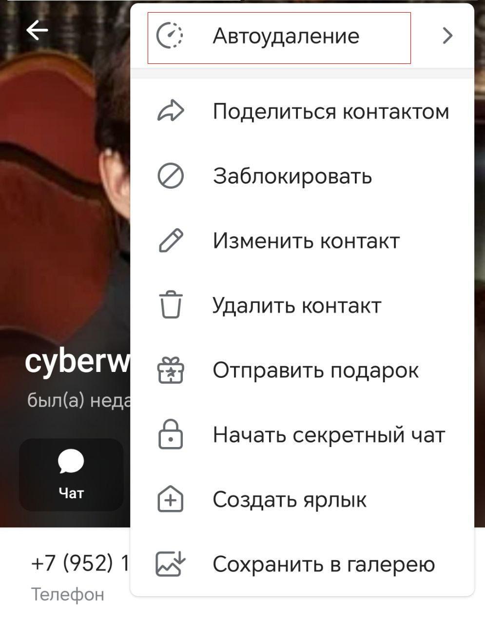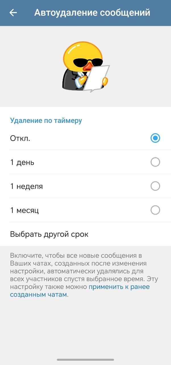 Можно включить таймер в конкретном чате (или в канале/группе, где у вас есть права администратора). Для этого выберите чат → профиль собеседника → три точки → «Автоудаление». Сроки те же: день/неделя/месяц или свой вариант. Отсчет идет с момента отправки. У собеседника появится пометка, что автоудаление включено. Важно: функция не уничтожает старые сообщения, она действует только на новые.
