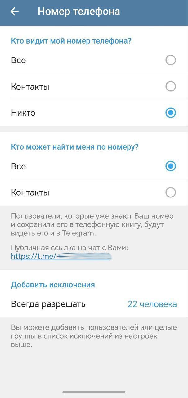 В разделе «Настройки» → «Конфиденциальность» → «Номер телефона» можно настроить, кто будет видеть ваши контакты, а кто нет.