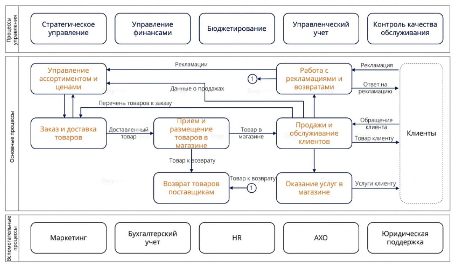 - основные. Напрямую связаны с тем, что компания производит и продает. Это производство, продажи, маркетинг, доставка. Именно такие процессы создают ценность и приносят доход, поэтому их важно наладить в первую очередь;