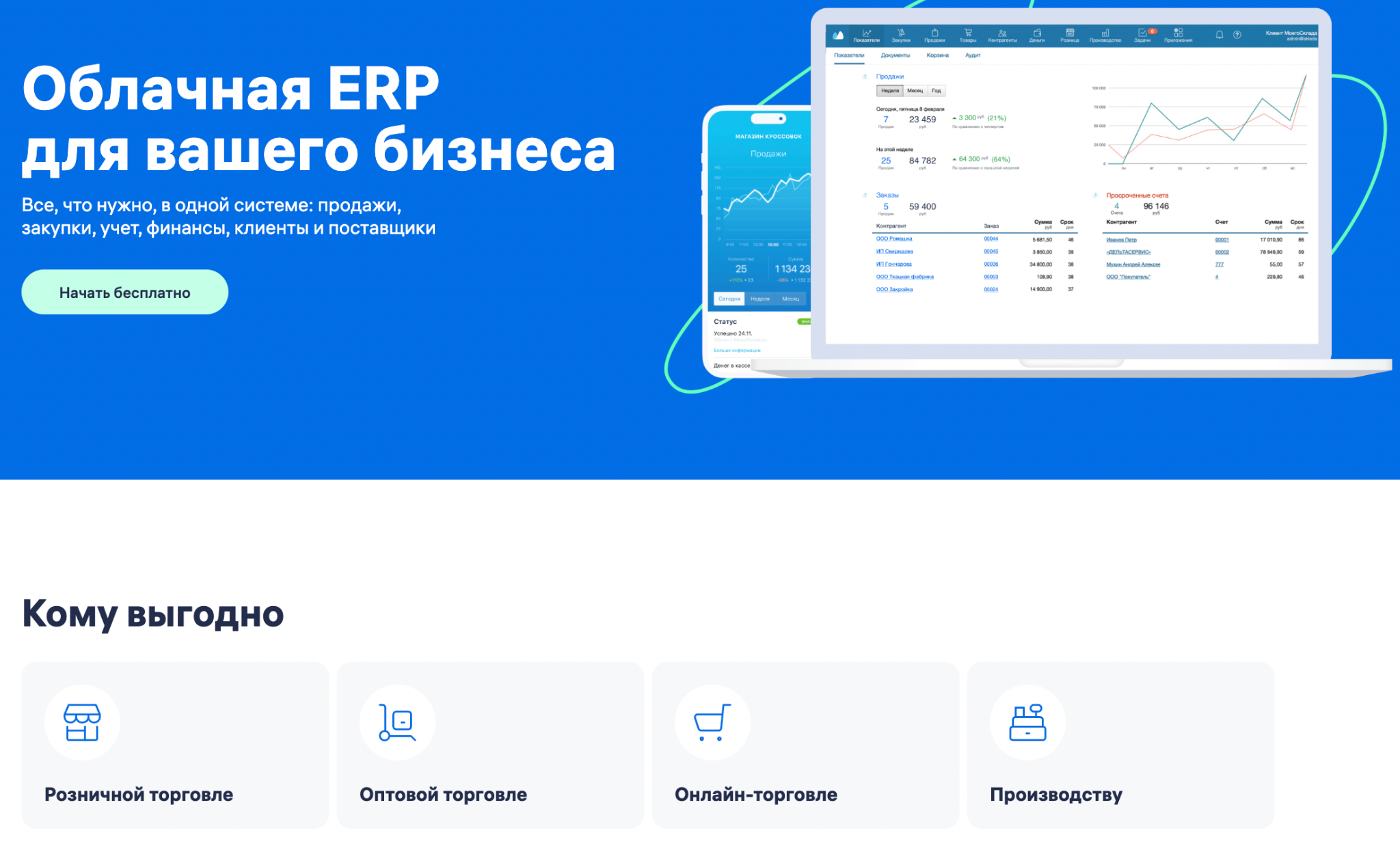 Кому подойдет: небольшим онлайн-магазинам, продавцам и компаниям, где основной доход — розничные продажи товаров.