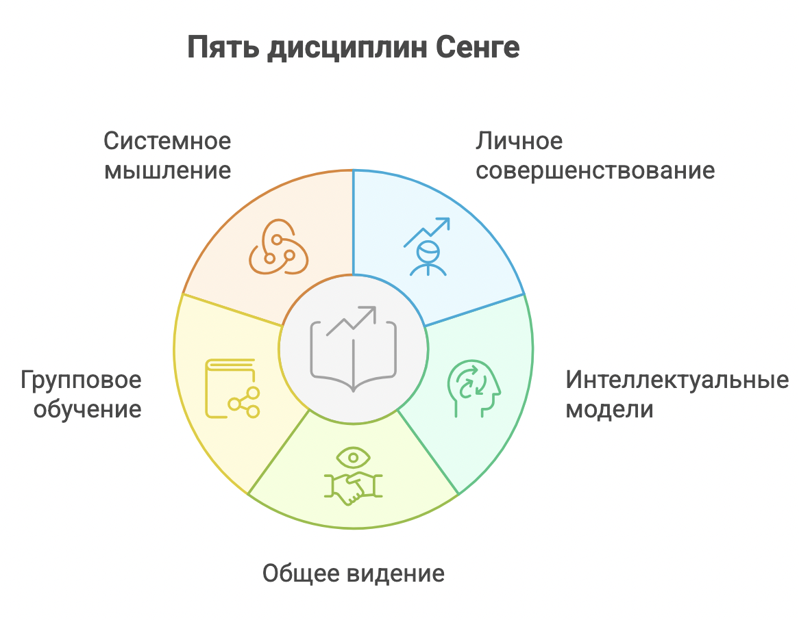 Это и есть «пятая дисциплина» — та, которая объединяет все остальные и делает организацию по-настоящему обучающейся.