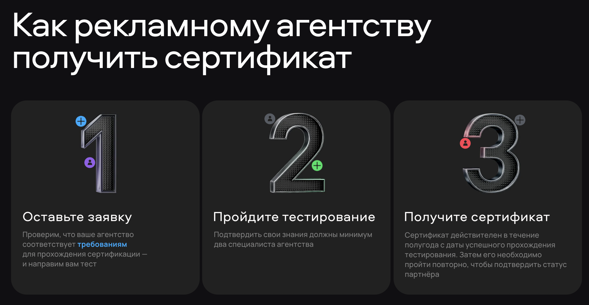 Экзамен включает 68 вопросов, посвященных инструментам и настройкам рекламного кабинета. Сертификат выдается при условии, что оба участника ответят правильно как минимум на 90% вопросов. На прохождение теста предусмотрено две попытки, а статус партнера требуется подтверждать каждые шесть месяцев.
