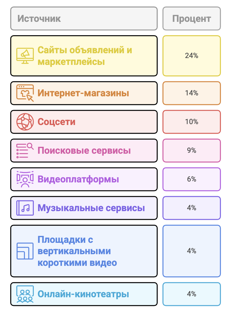 Чаще всего реклама превращается в реальные покупки на сайтах объявлений и маркетплейсах — об этом сообщили 24% участников исследования. Далее следуют: