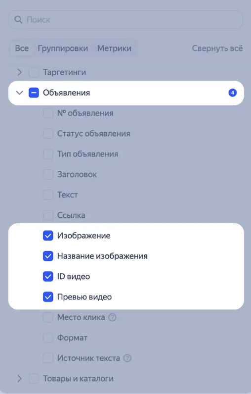 2. Новые группировки контента. В разделе «Объявления» добавлены дополнительные группировки, позволяющие анализировать элементы креатива: