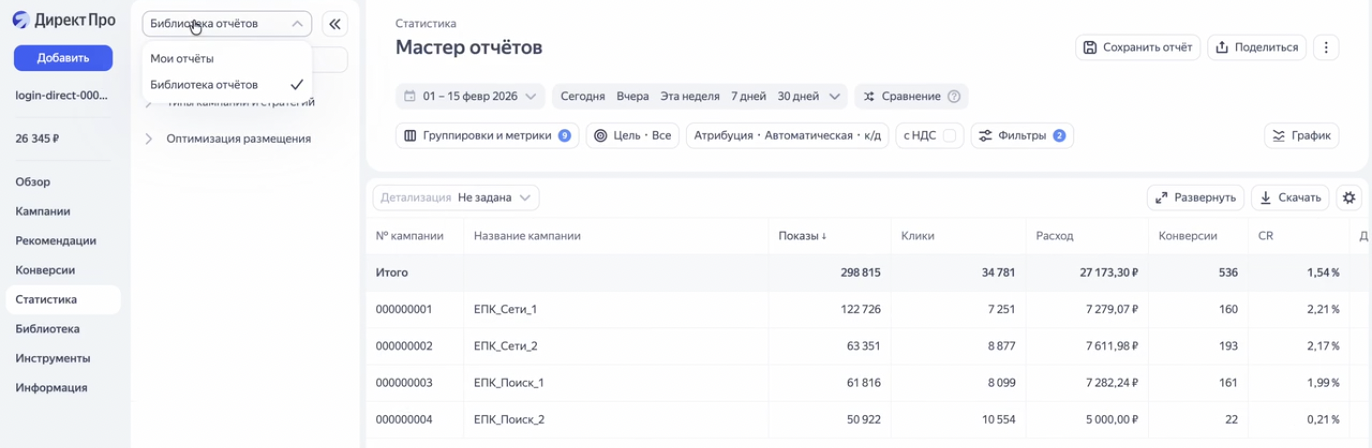 4. Навигация по отчетам. В интерфейсе появилась панель переключения между сохраненными отчетами и отчетами из Библиотеки. При переходе между ними сохраняются выбранные фильтры и контекст анализа кампании, благодаря чему специалистам не нужно заново настраивать параметры.