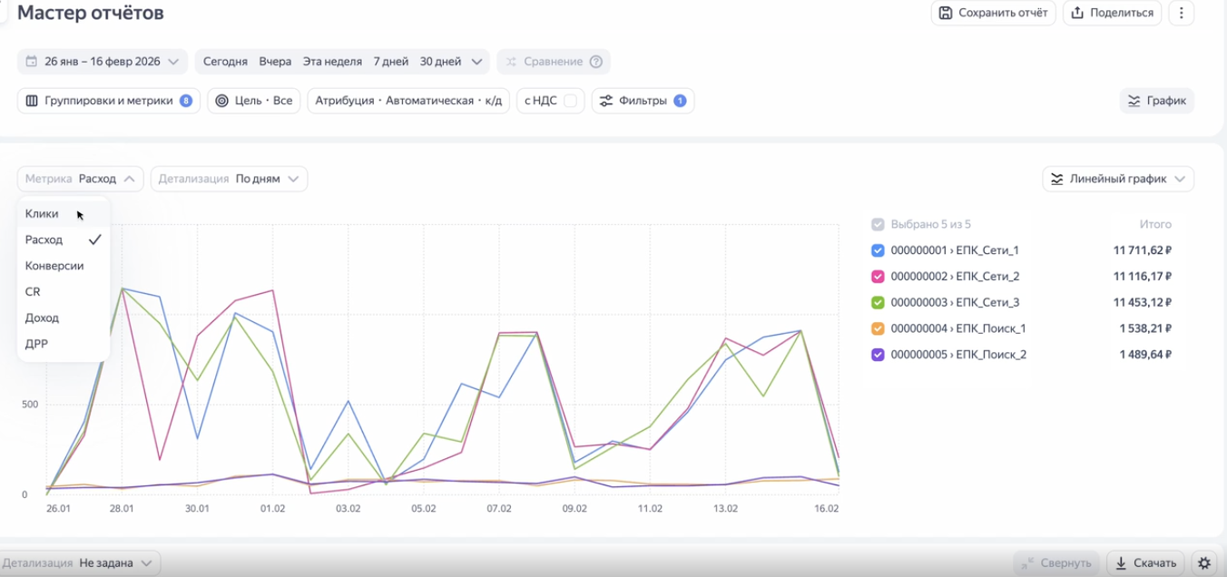 1. Визуализация данных. Помимо стандартных таблиц с метриками (показы, клики, расход, конверсии), в интерфейсе появились графики. Пользователи могут настраивать период анализа, выбирать нужные показатели и формат отображения данных, а также переключаться между режимами «таблица» и «график» прямо внутри одного интерфейса.